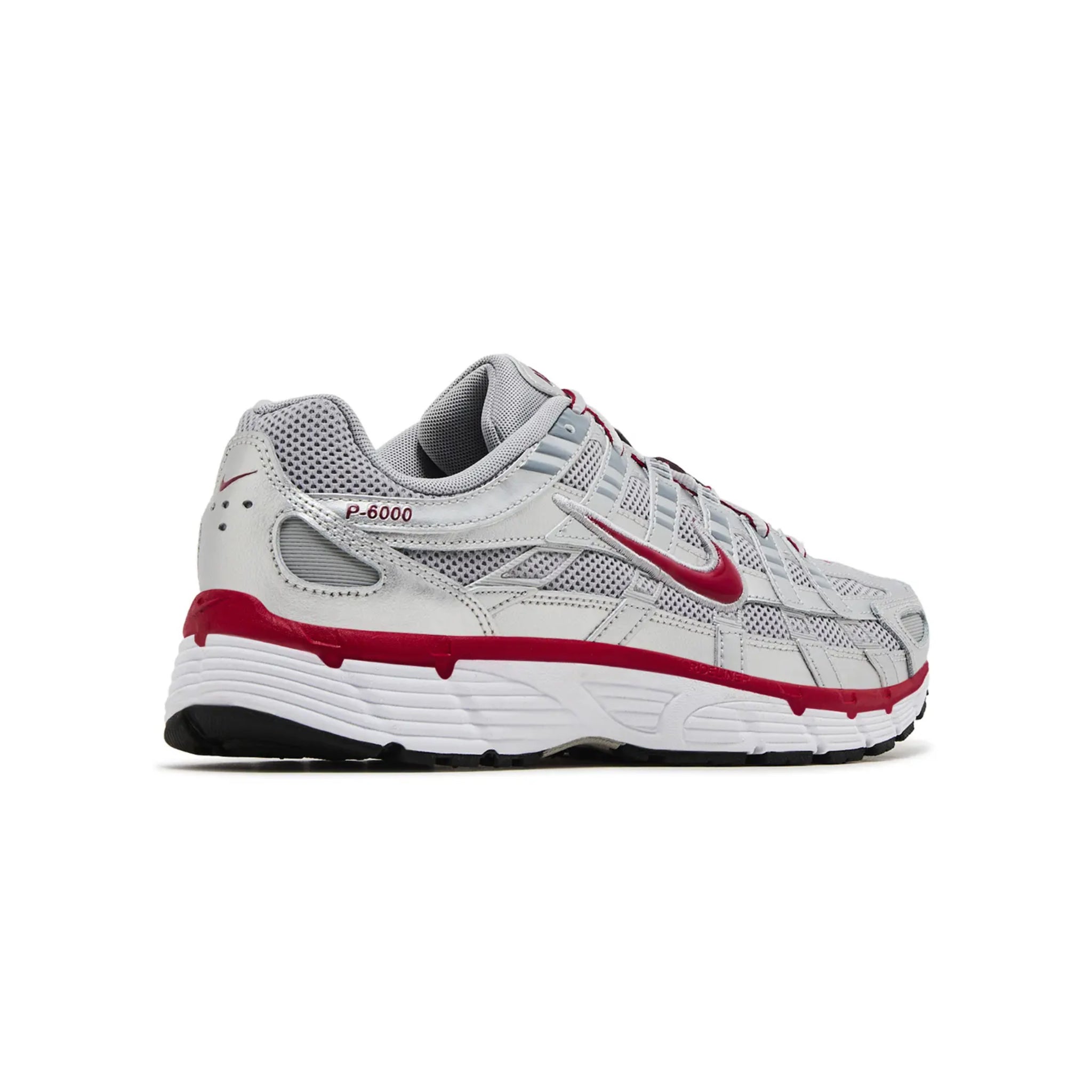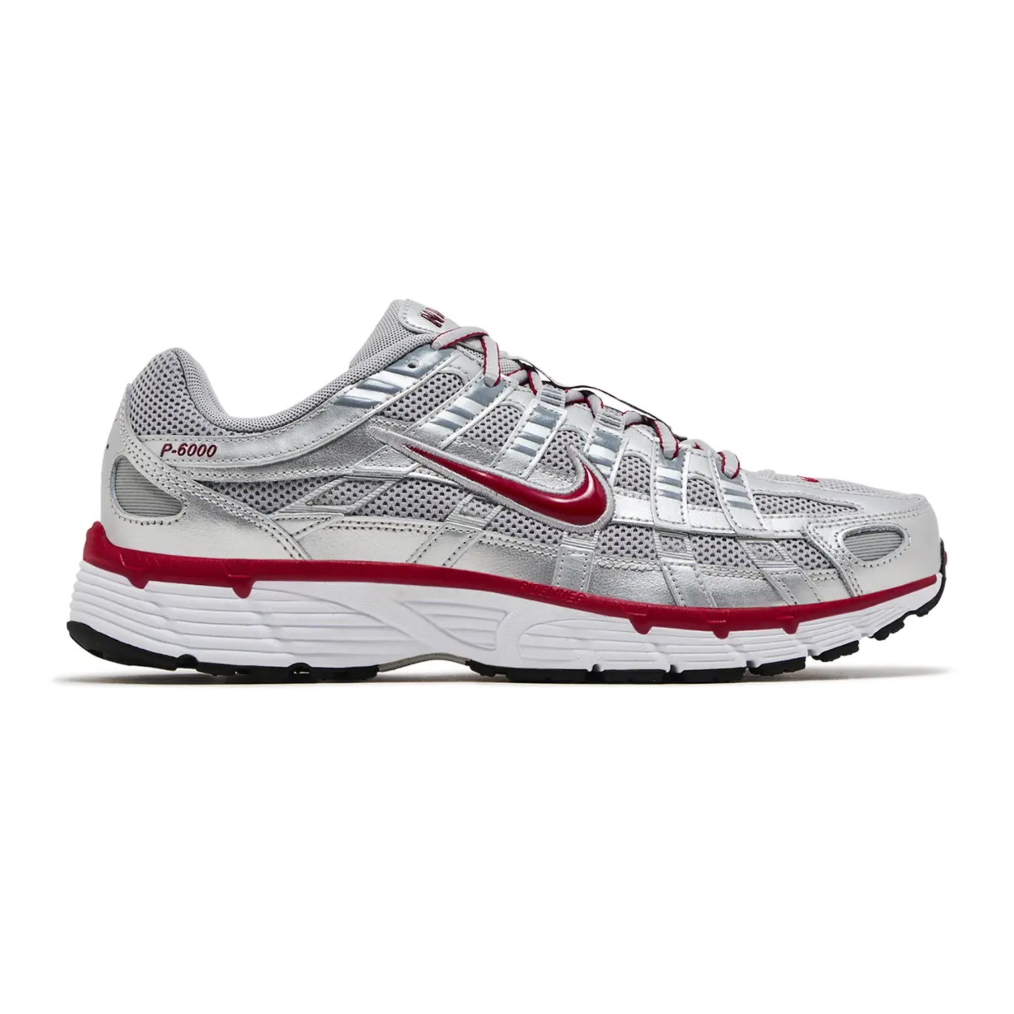 The Nike P-6000 'Metallic Silver Gym Red' combines a striking metallic silver upper with bold gym red accents for a dynamic look. Crafted from layered mesh and synthetic materials, it provides breathability and durability, while the lightweight cushioned midsole offers responsive support for all-day comfort. This design merges vintage running inspiration with modern performance, ideal for those seeking both style and function in a versatile sneaker.