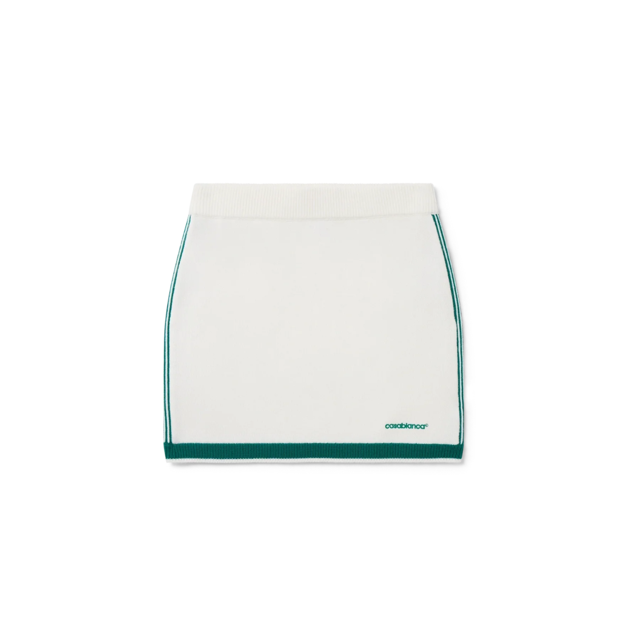 The knit tennis skirt is a fitted mini-skirt design crafted from a merino wool fabric. Completed with an elasticated waistband, contrast edge detail on the hem, stripe detail down the sides, and the Casablanca logo.