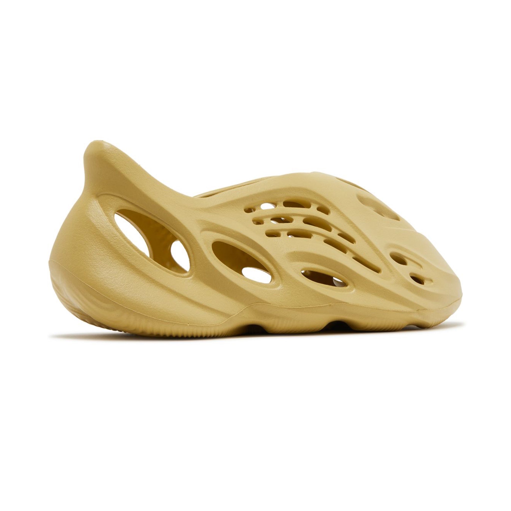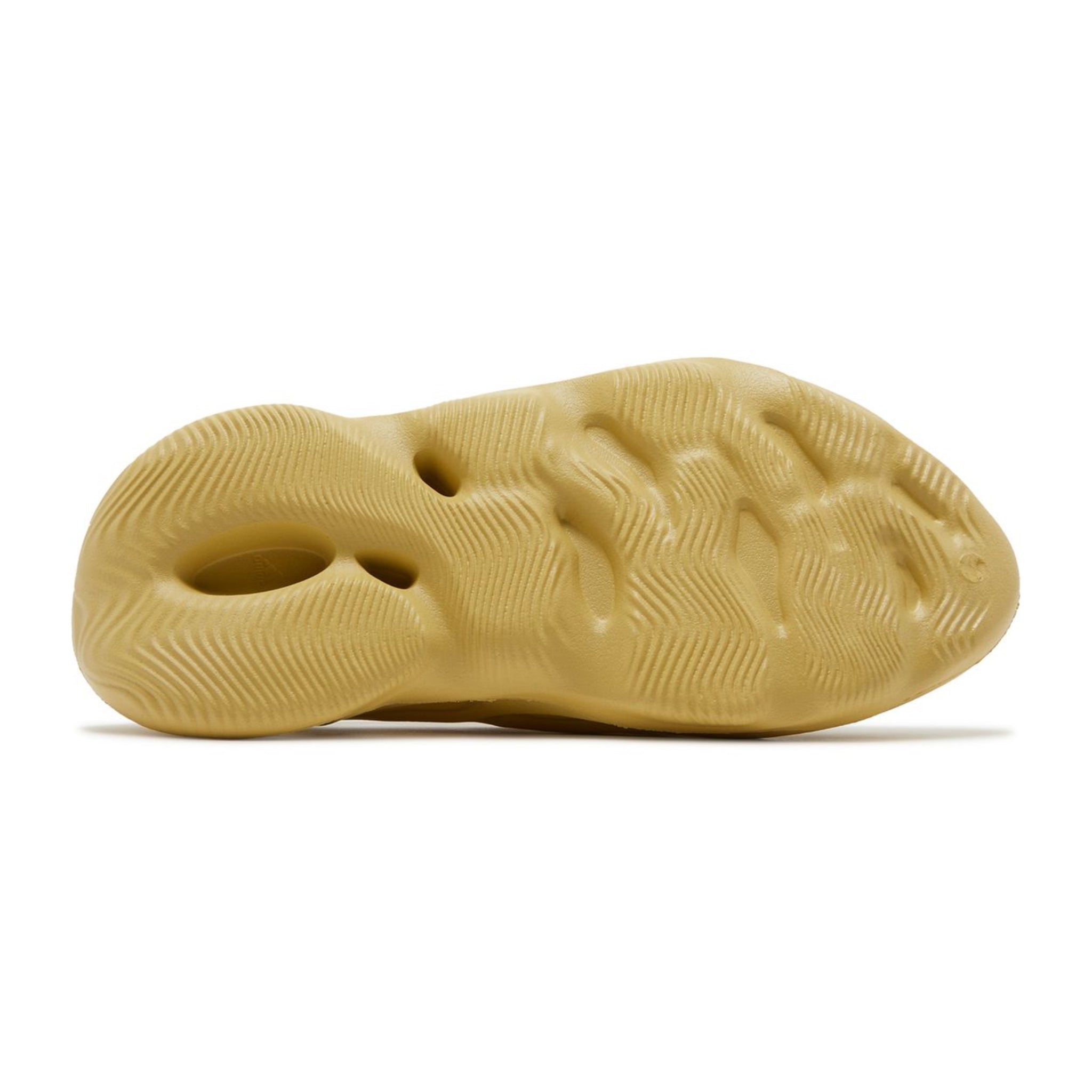 The adidas Yeezy Foam Runner 'Sulfur' slip-on features an all-over pale ochre finish, built from EVA foam and hydroponically produced algae. Ventilation ports providing breathability are visible on the vamp and side panels. A raised sculpted heel offers a supportive, comfortable fit. A wave-patterned outsole anchors the lightweight design and adds traction.