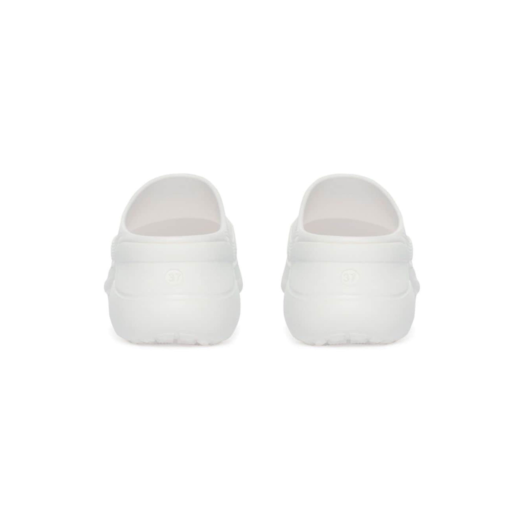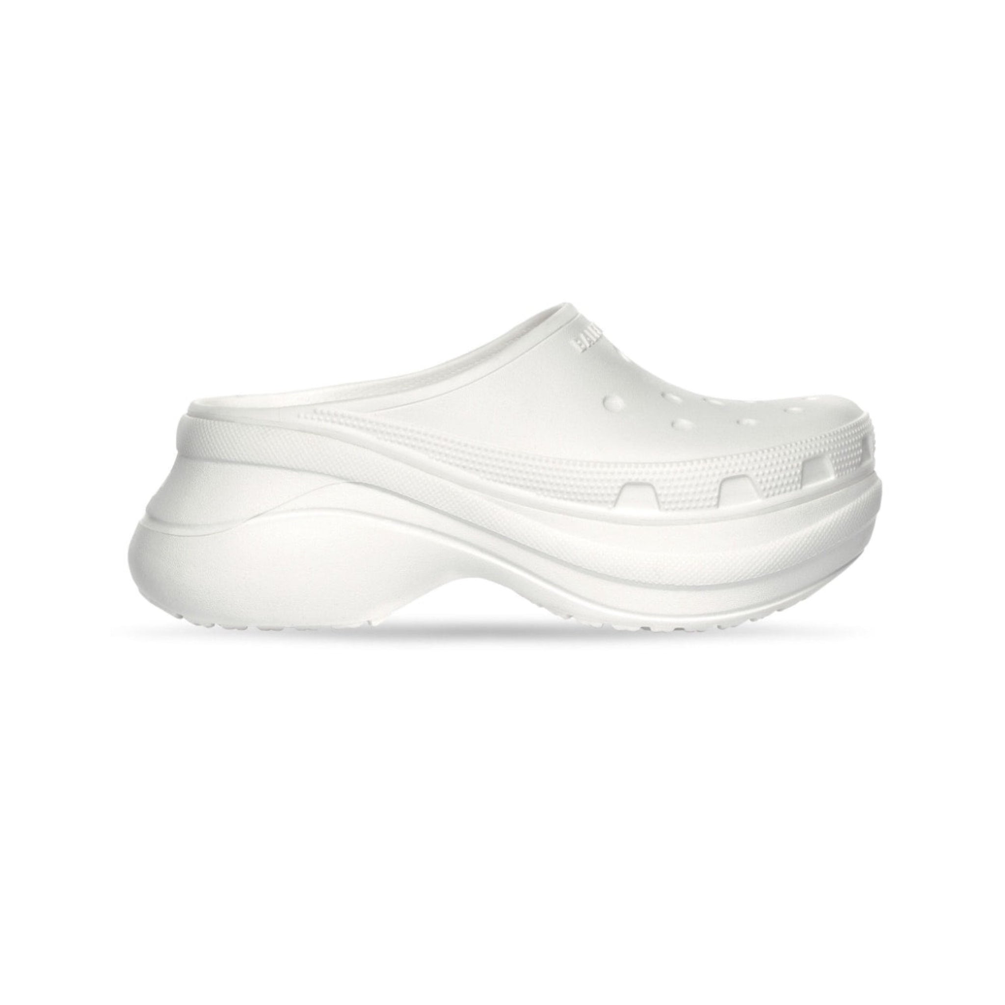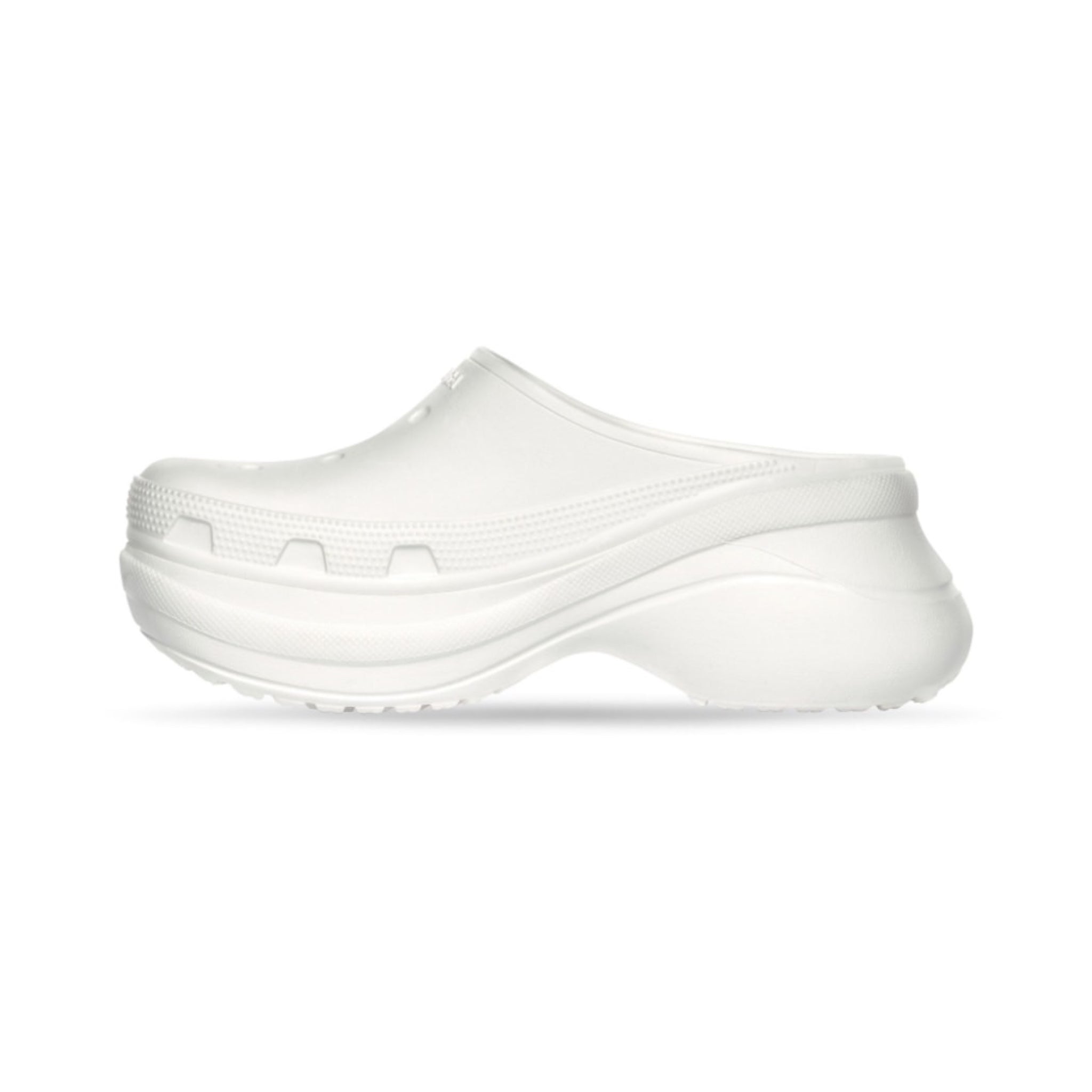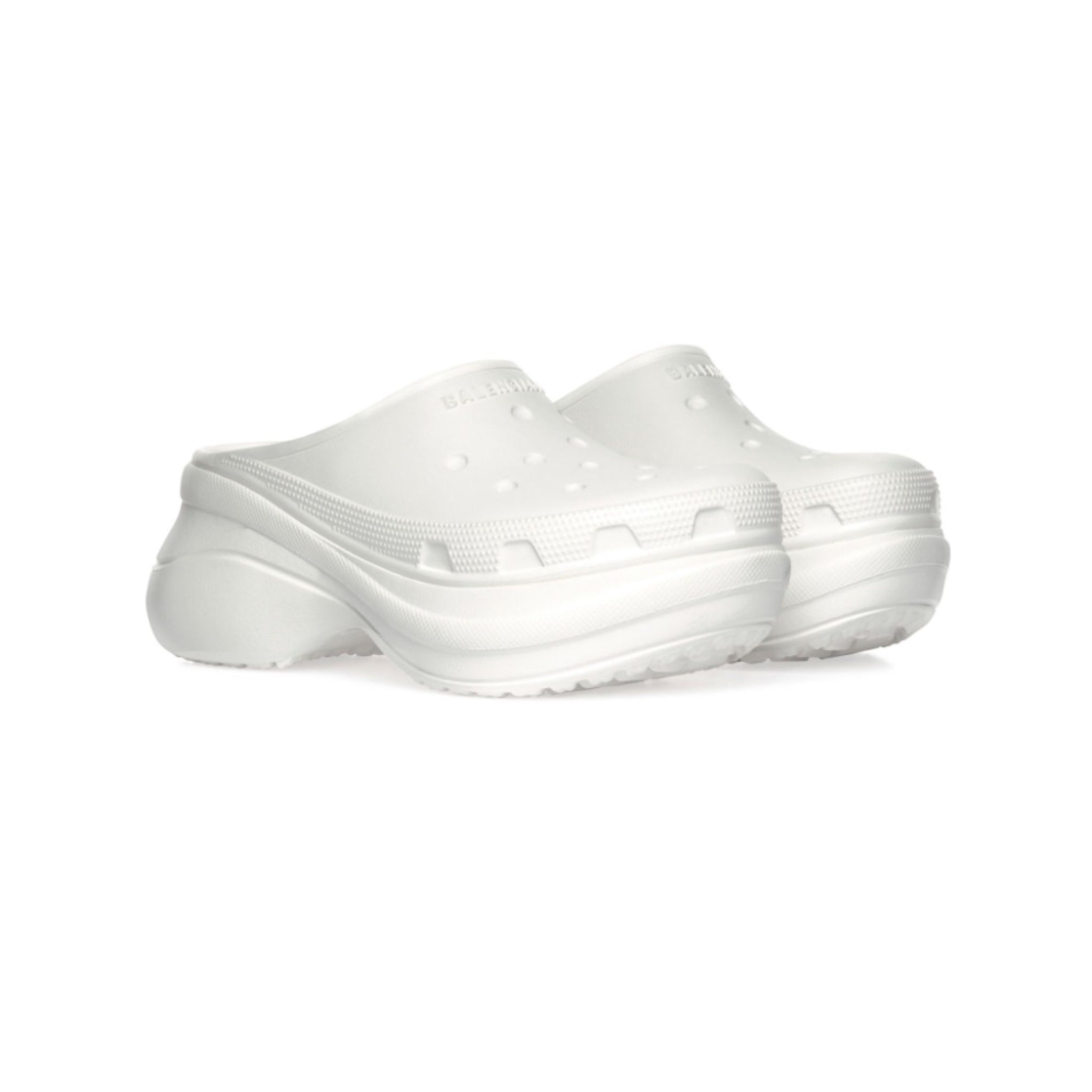 Partnering with Crocs, Balenciaga puts its stamp on the iconic rubber footwear style in this platform iteration. The typically perforated silhouette is alluded to through the embossed detailing, with the addition of Balenciaga's name at the front and signature shoe size to the rear adding a branded element to the pair.