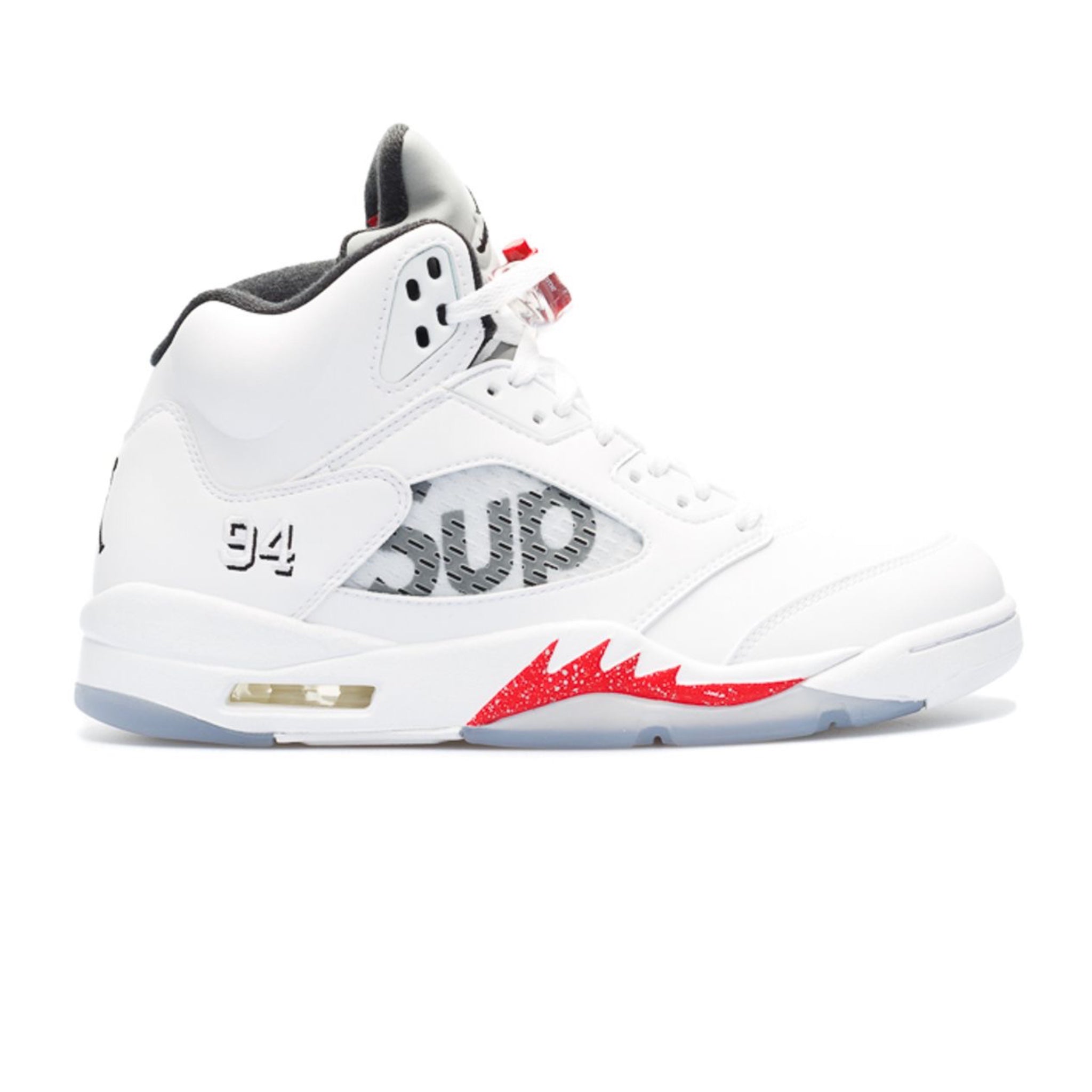 Dropping in October 2015, the Supreme x Air Jordan 5 Retro ‘White’ showcases a rare collaborative effort centered around Jordan 5. Like its black and desert camo counterparts, this pair features a reflective silver tongue with ‘94’ branding and ‘Sup’ lettering on the quarter panel. The rest of the upper is built with white leather, mounted atop a matching white midsole with red shark tooth detailing.