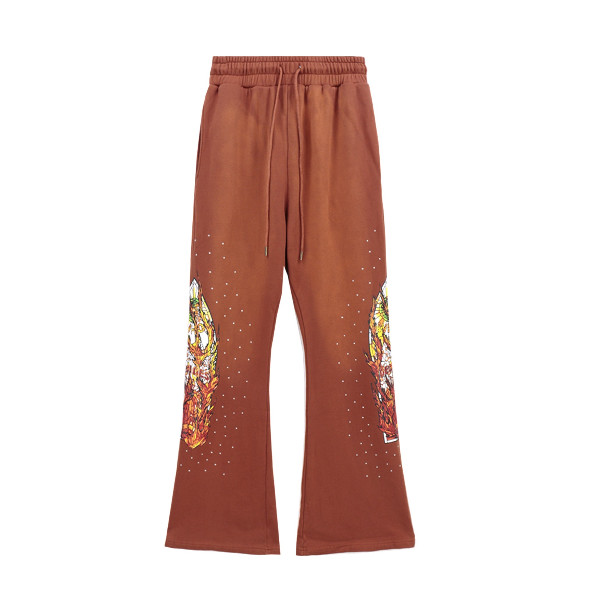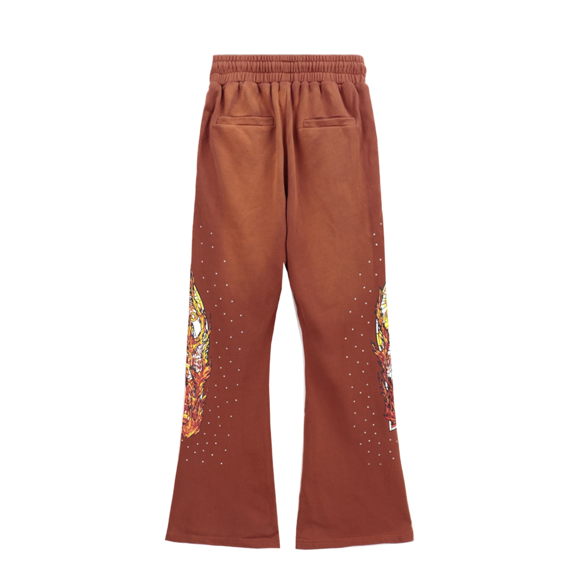 These brown flared pants combine a distressed, acid-wash effect with bold graphic prints of fiery skull motifs on each leg, creating a striking vintage streetwear look. Designed with a drawstring waist, they offer adjustable comfort while making a strong style statement for alternative fashion enthusiasts.