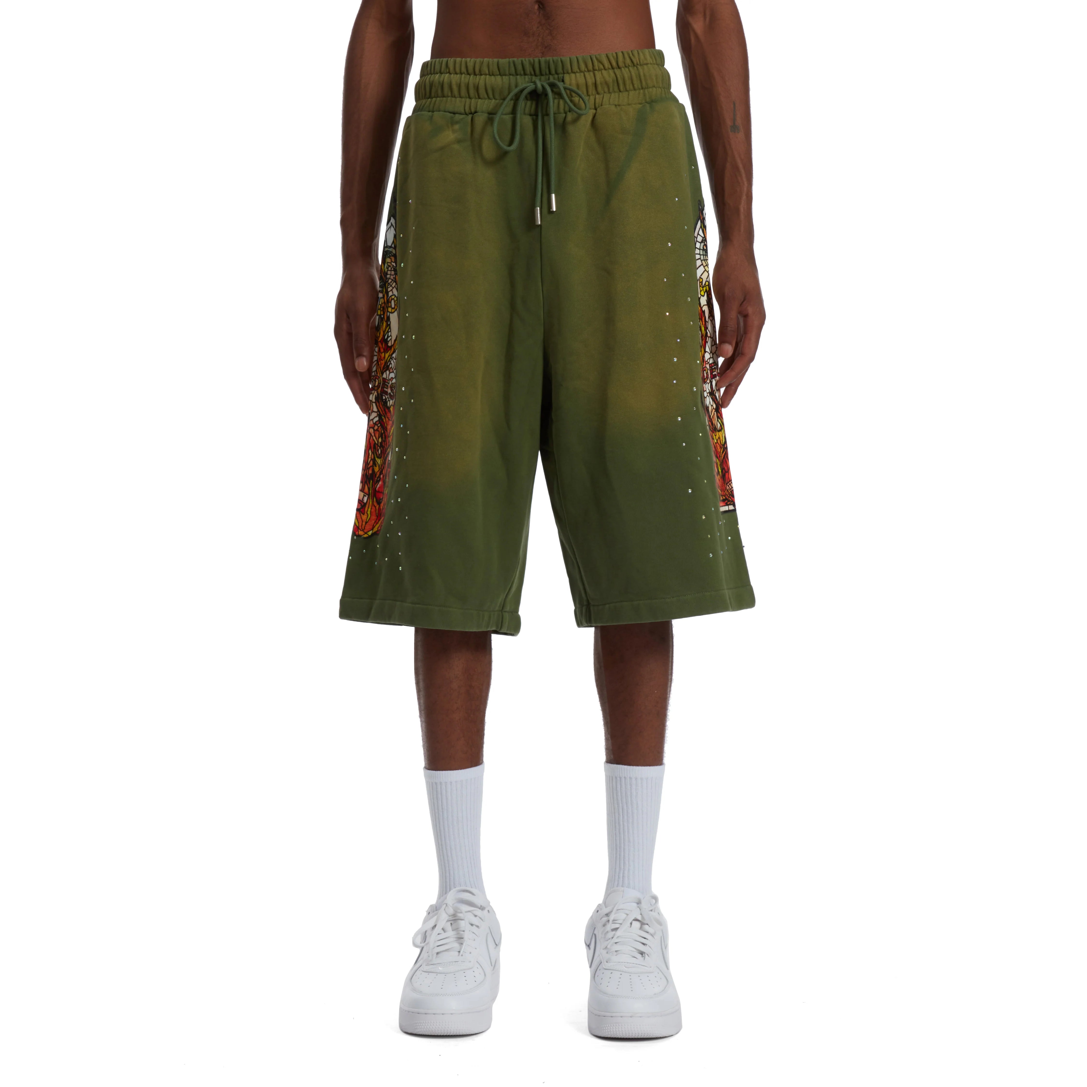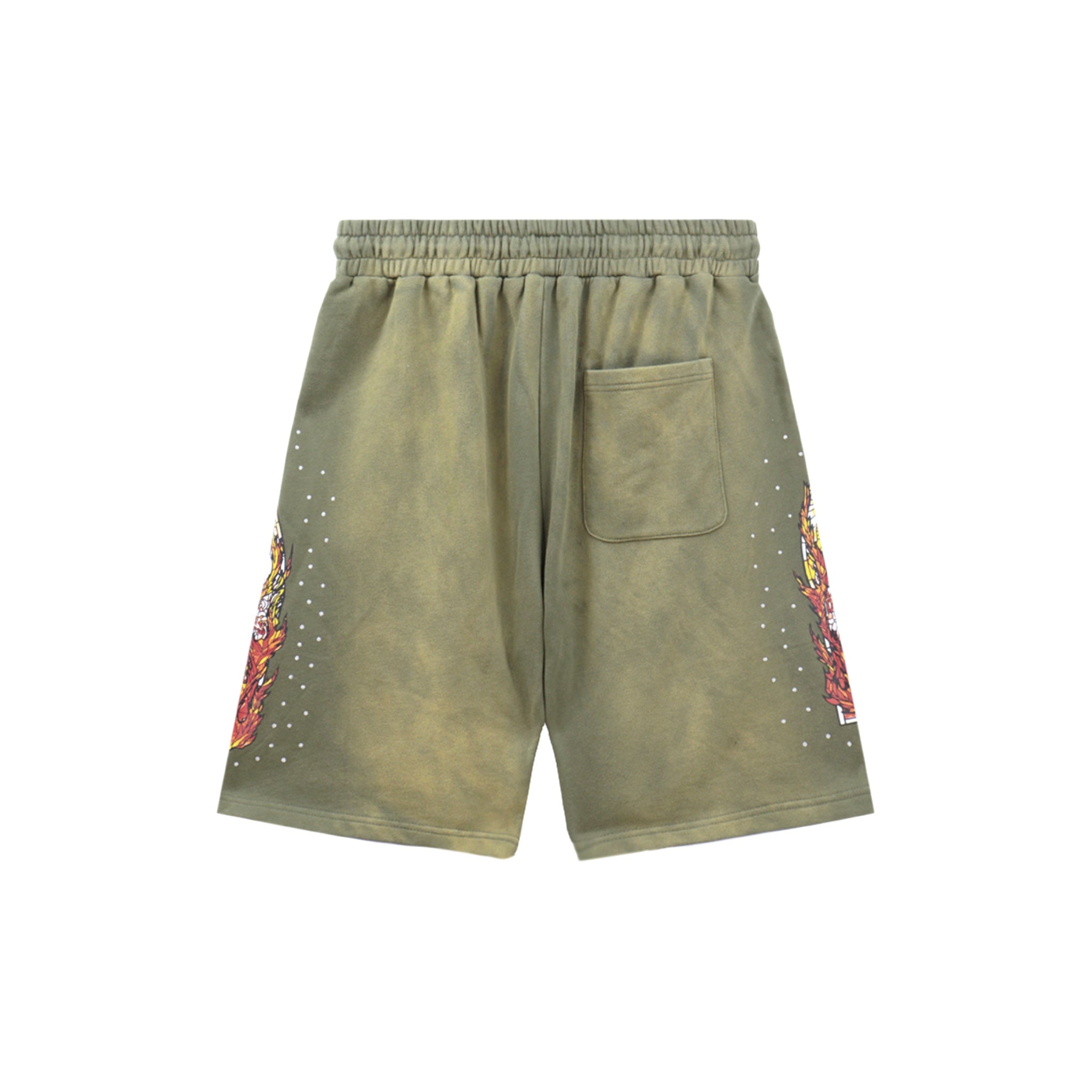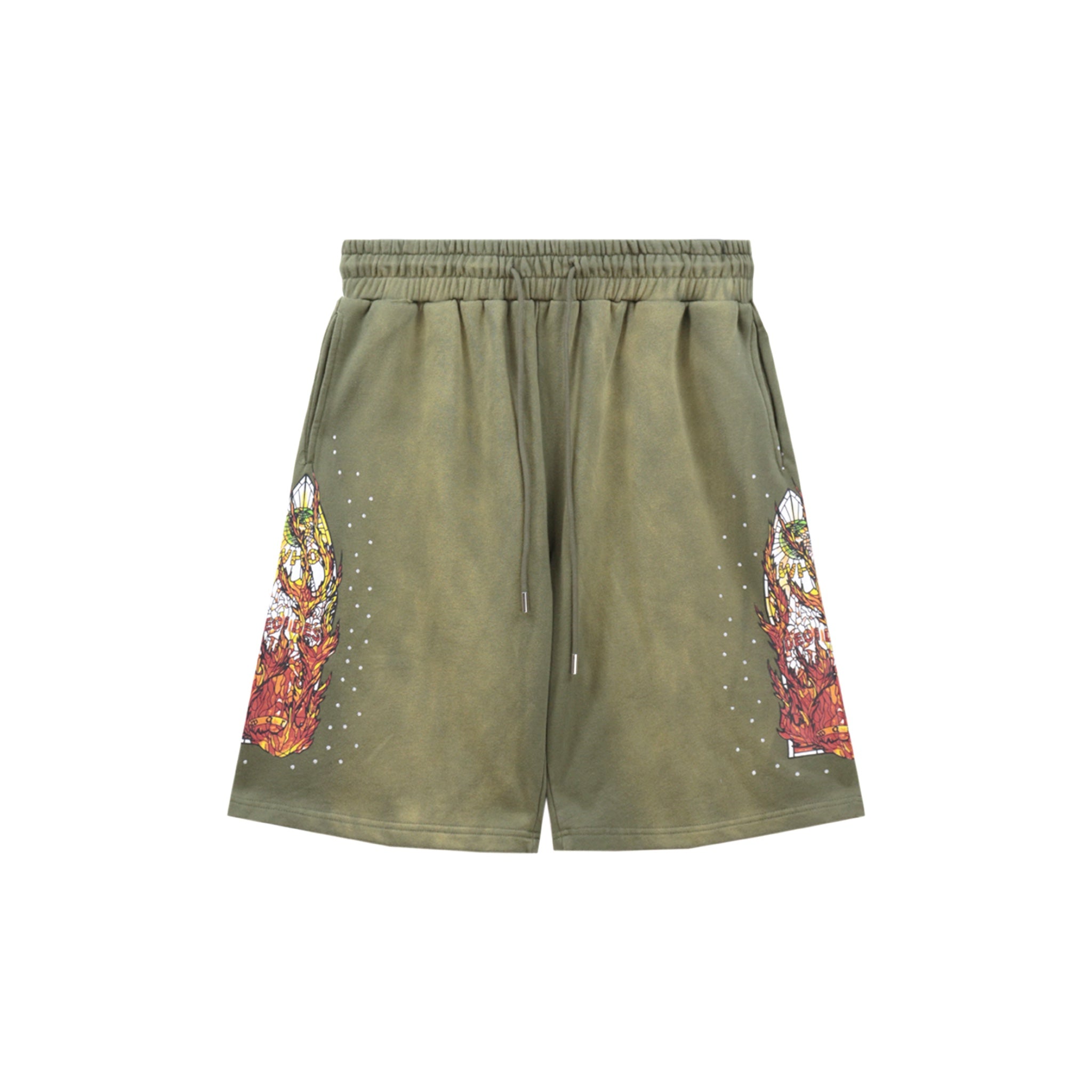These olive green flared sweat shorts combine a distressed, acid-wash effect with bold graphic prints of fiery skull motifs on each leg, creating a striking vintage streetwear look. Designed with a drawstring waist, they offer adjustable comfort while making a strong style statement for alternative fashion enthusiasts.