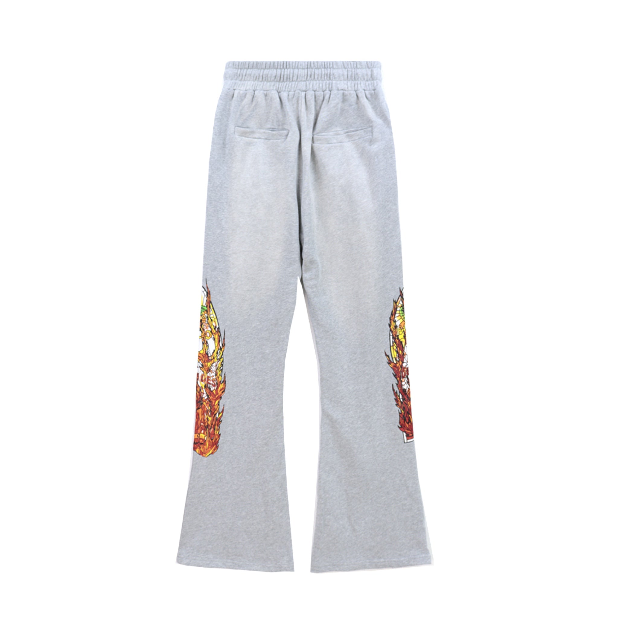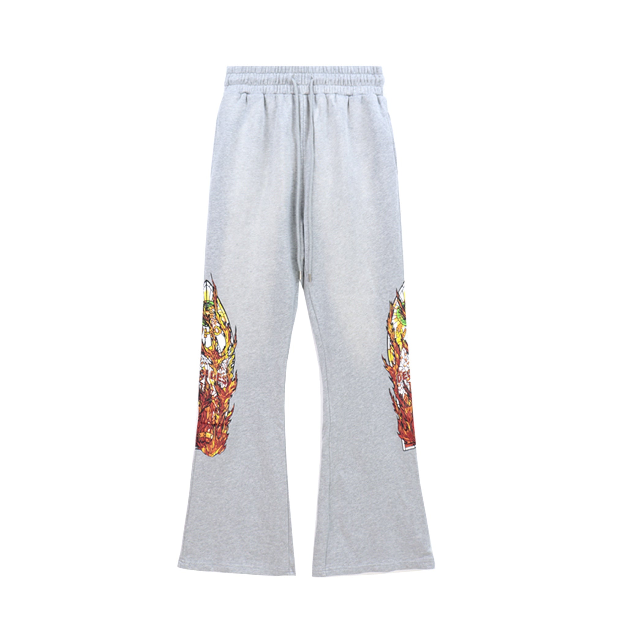 These silver flared pants combine a distressed, acid-wash effect with bold graphic prints of fiery skull motifs on each leg, creating a striking vintage streetwear look. Designed with a drawstring waist, they offer adjustable comfort while making a strong style statement for alternative fashion enthusiasts.