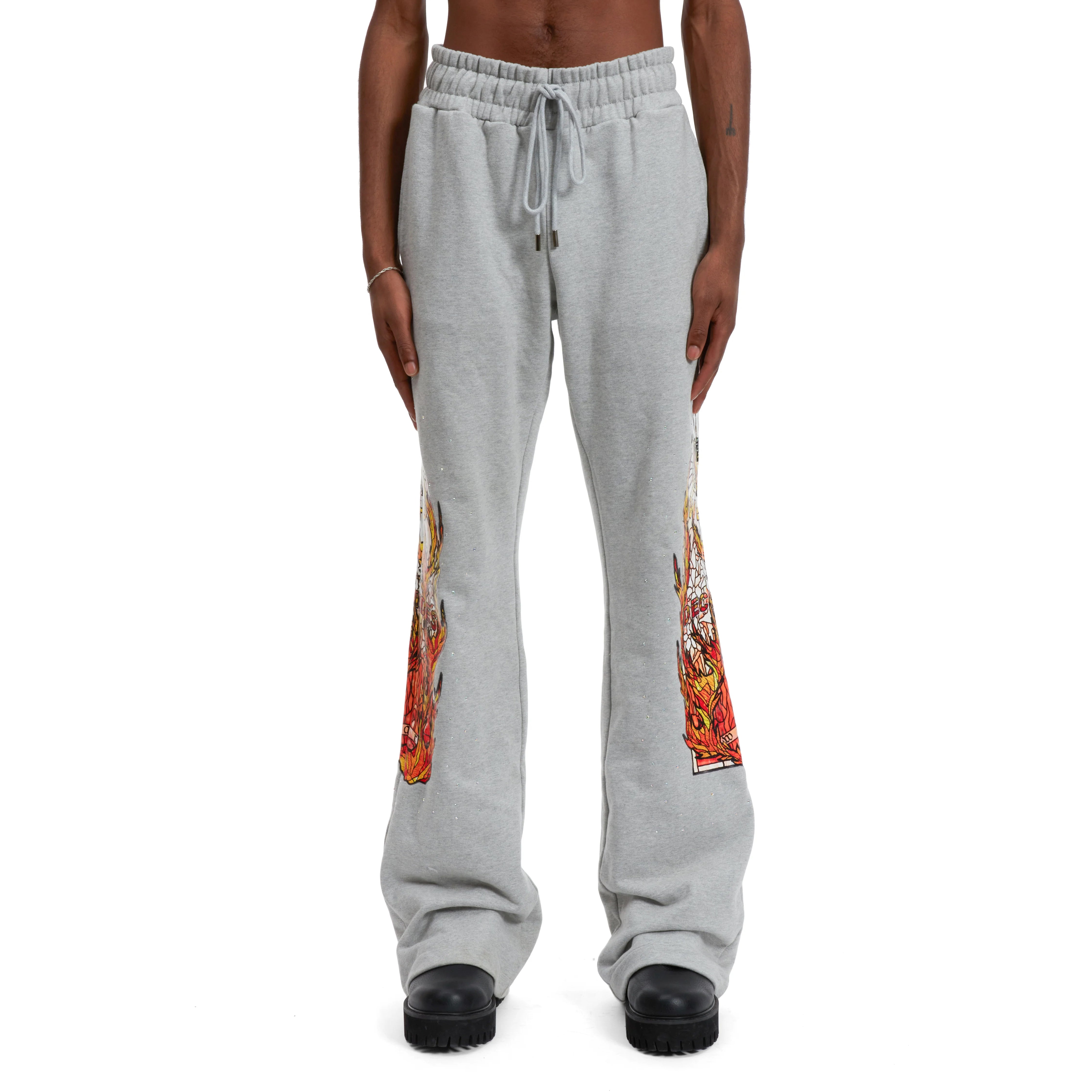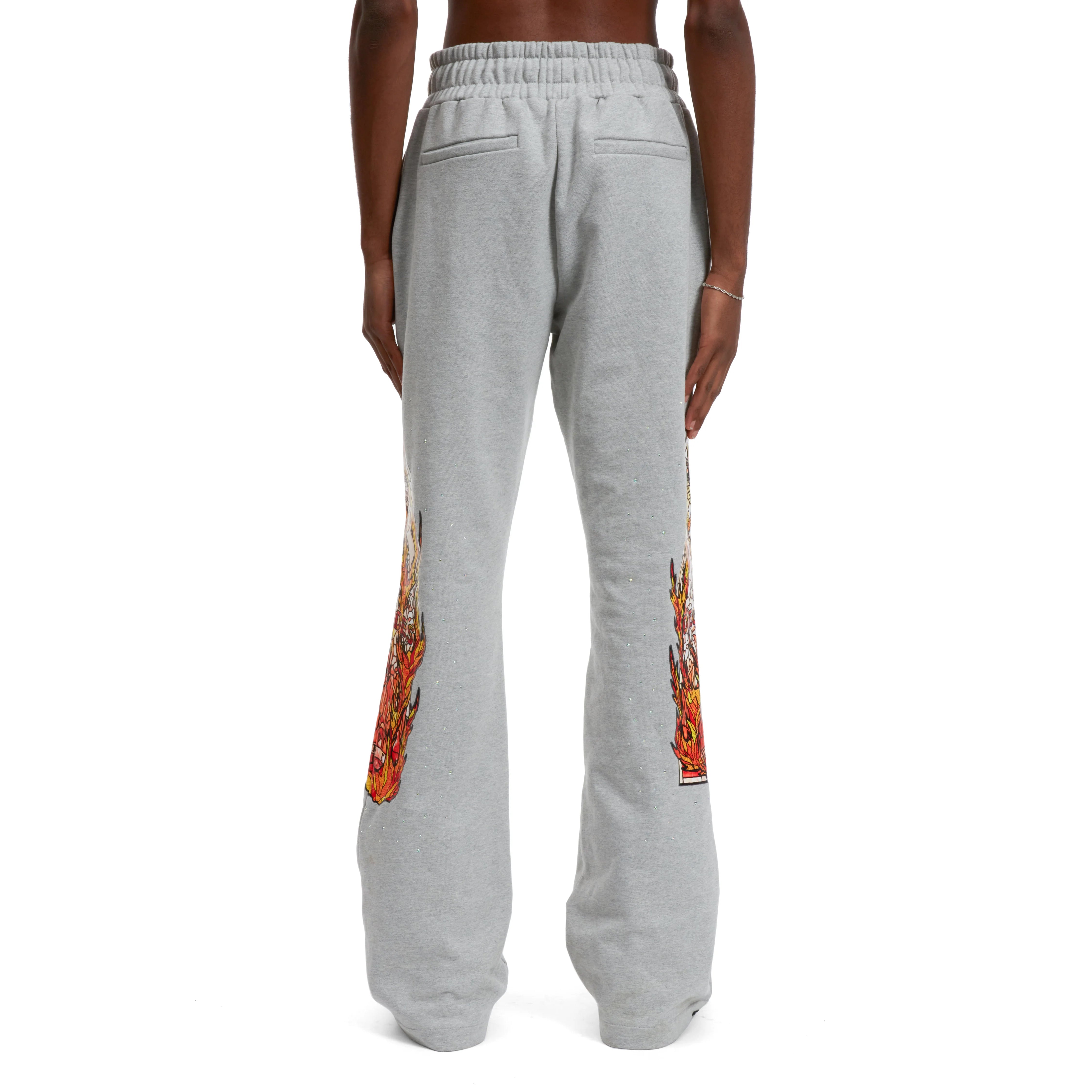 The Flame Glass Sweatpant is a 100% cotton with a regular fit, flared opening, embroidery and rhinestones applied throughout.
