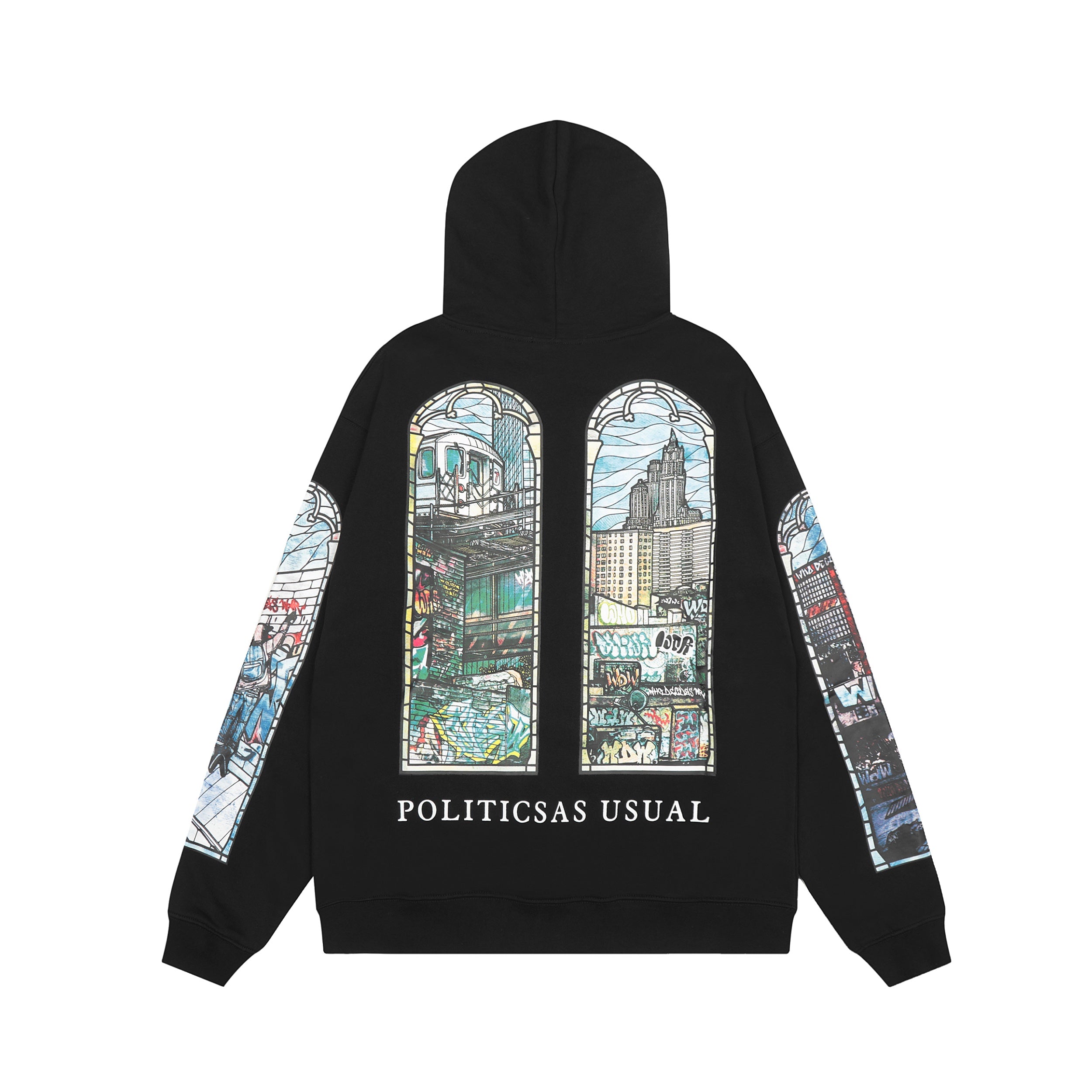 The Politics as Usual Hooded Sweatshirt Glass is made from 100% cotton with a regular fit, hooded neck, printed sleeves, and rhinestones applied throughout.