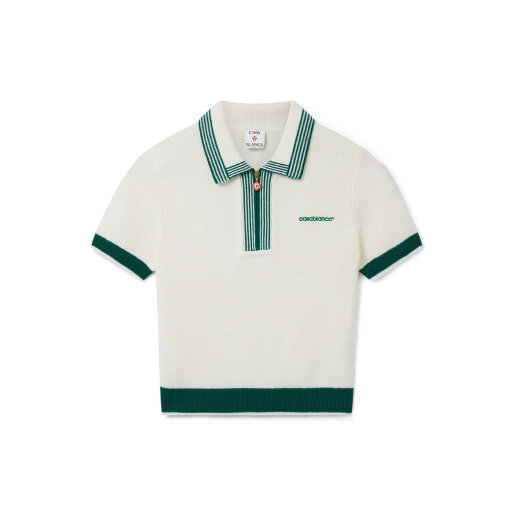 The knit tennis polo shirt is a classic design crafted from a merino wool fabric. Completed with contrast ribbed edge detail on the cuffs, hem, collar and placket, front zip closure, a rib collar and Casablanca logo.