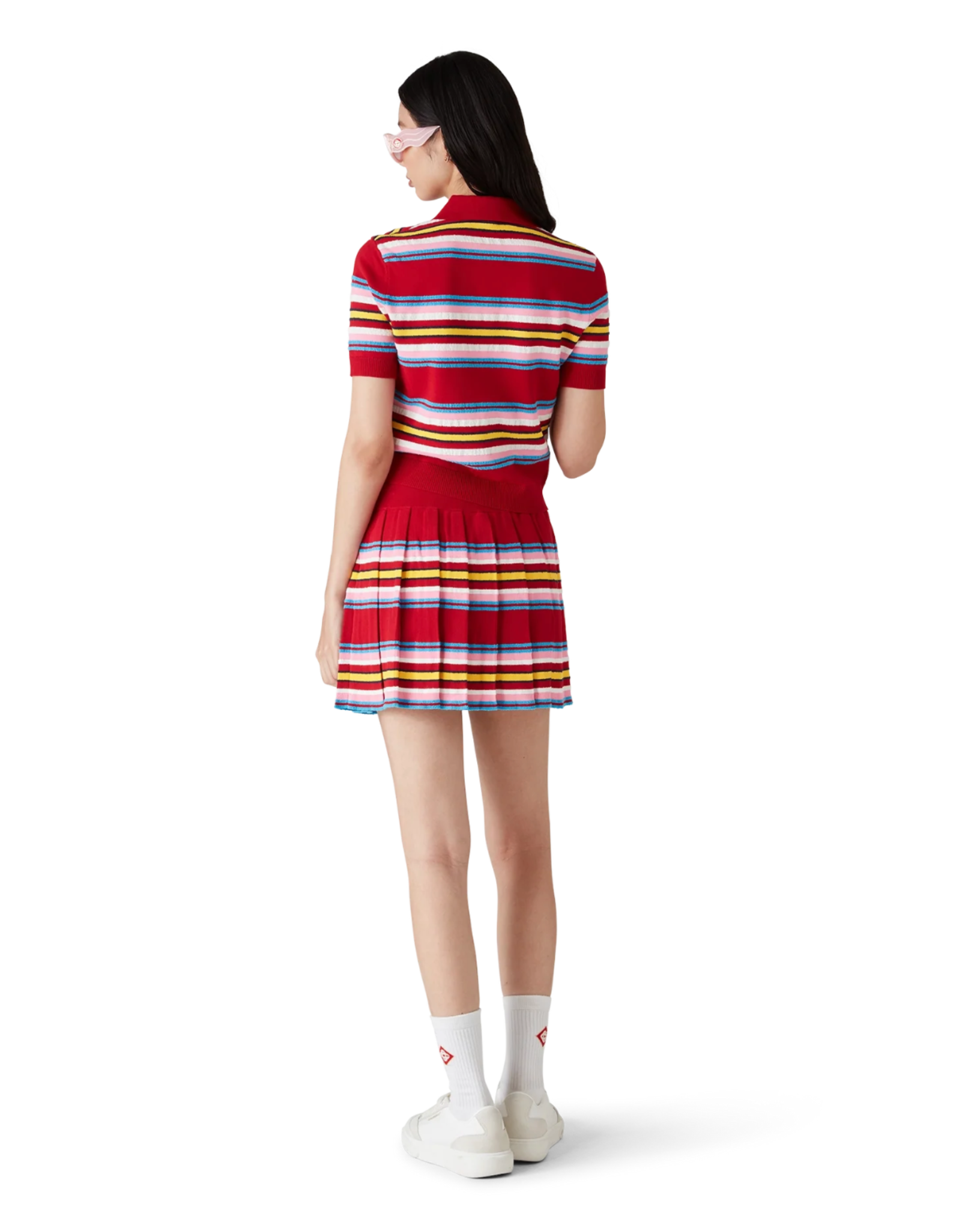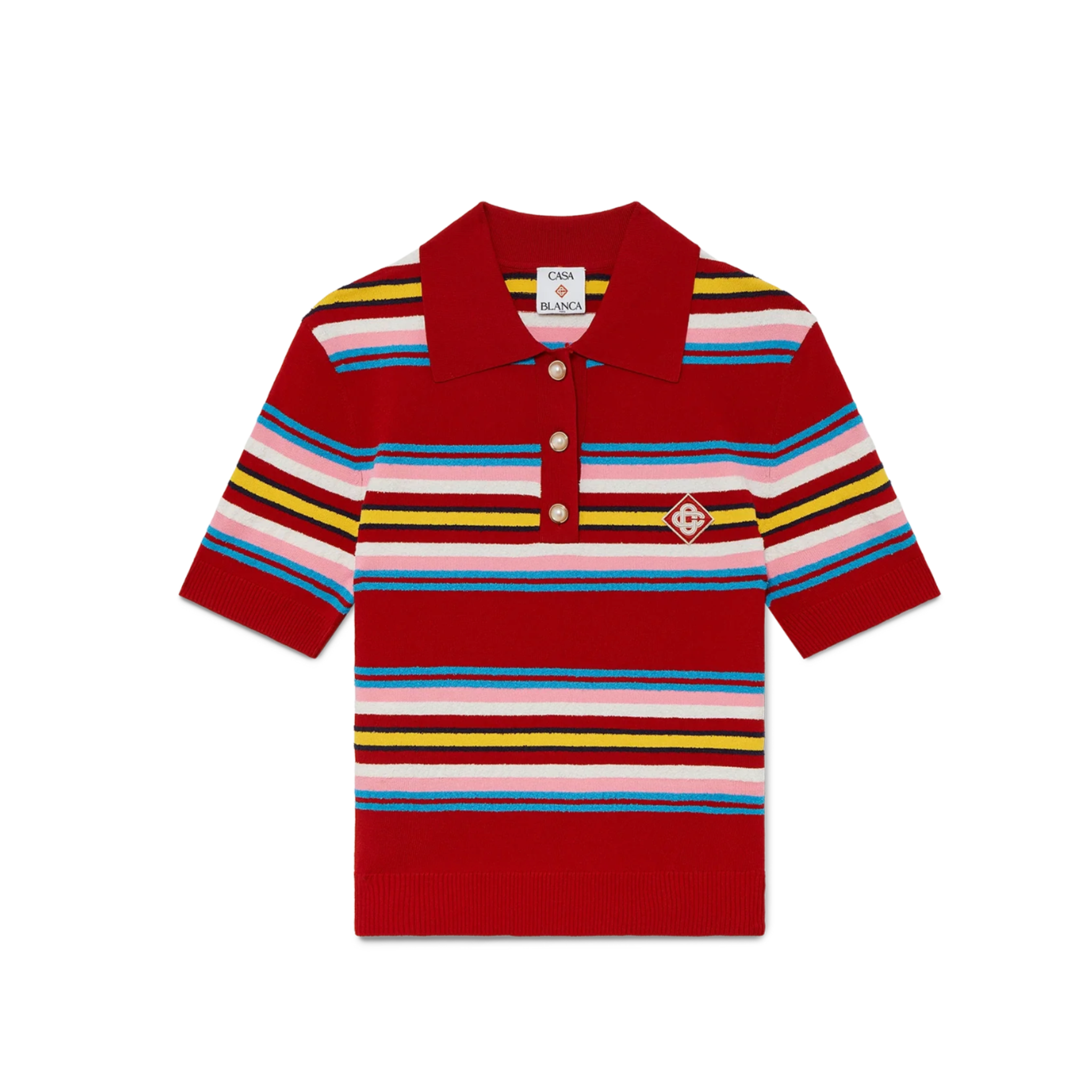 The stripe polo shirt is a short-sleeve design crafted from stripe knitted fabric featuring the house's signature diamond logo. Completed with signature gold rim pearl buttons, three-button placket, and rib cuffs, hem, collar and placket.
