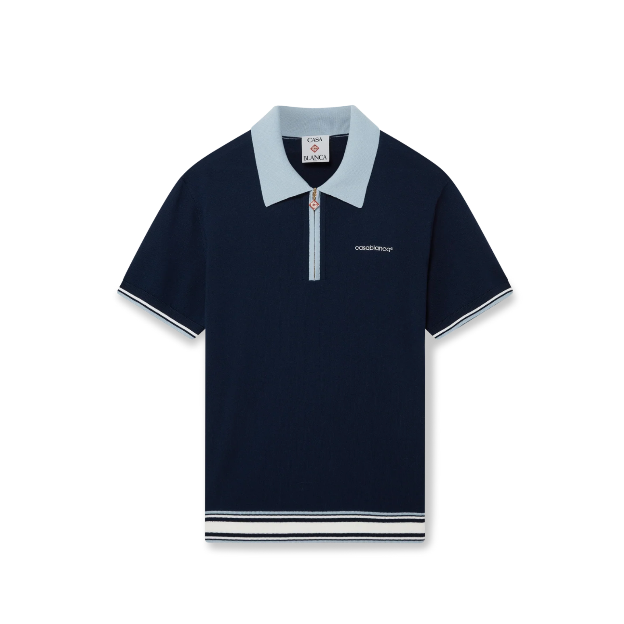 The merino knit tennis polo shirt is a short-sleeve design crafted from merino wool fabric. Completed with a zip closure, signature diamond logo zipper tab, stripe hem and cuffs details, a contrast rib collar and placket, and the house's Casablanca logo.