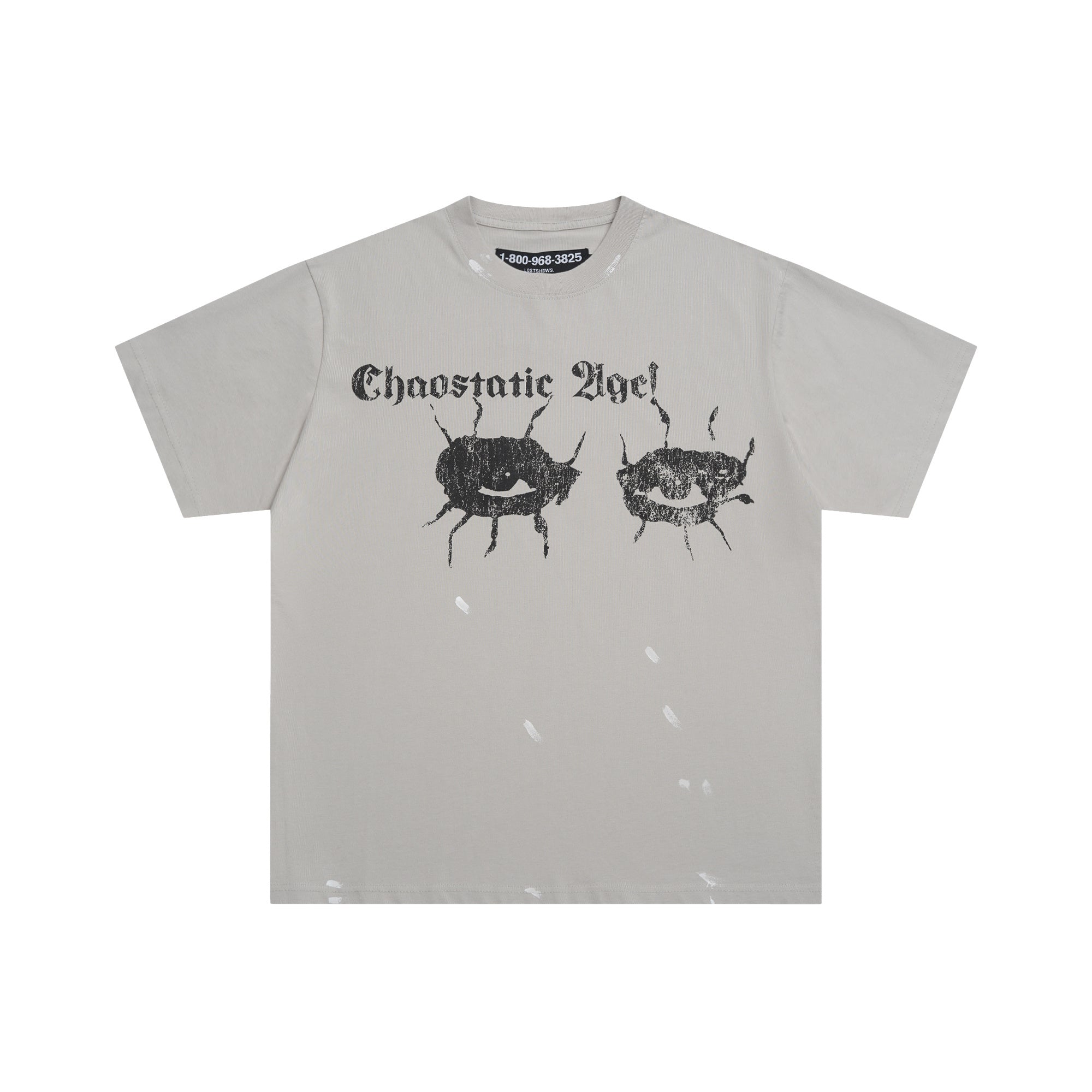 Channel the spirit of collapse and rebirth in the *Chaostatic Age Tee*. Made from premium 100% cotton, this ash-gray, distressed T-shirt features a bold, cracked graphic of two all-seeing eyes breaking through the surface — a symbol of vision amidst chaos. Above, the phrase "Chaostatic Age!" is printed in a gothic font, setting the tone for a world teetering between order and destruction. The shirt’s vintage wash and intentional distressing make every piece one of a kind.