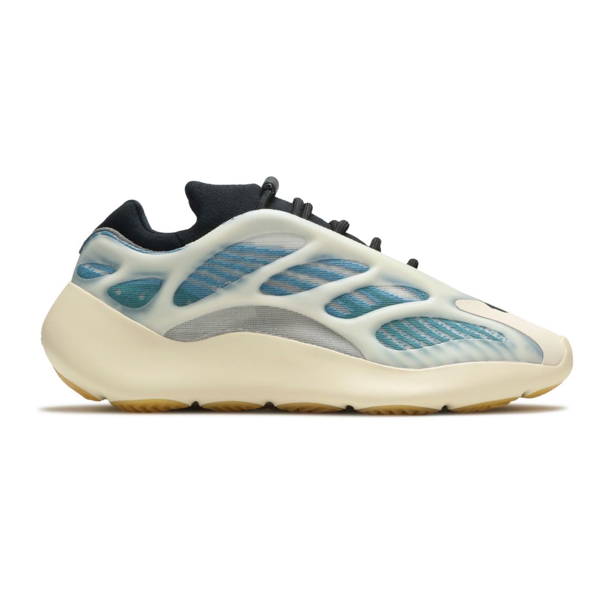 The Yeezy 700 V3 'Kyanite' sports vibrant accents on its signature construction. Built with monofilament engineered mesh, the shoe's upper appears with a white base highlighted by flowing blue stripes, overlaid by an RPU cage that glows in the dark. An inner bootie construction supports the fit, with a rubber toe cap included for durability. Underfoot, a PU cage encapsulates the EVA midsole, which provides cushioning, giving way to a herringbone rubber outsole for traction.