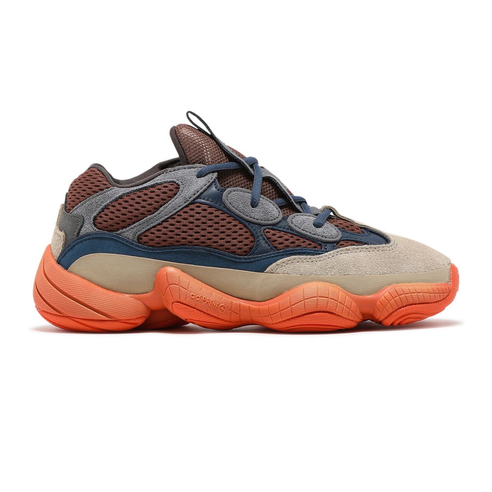 The Yeezy 500 'Enflame' features vibrant tooling on its signature construction. The shoe's upper is built with a mix of open mesh and suede, finished in brown, tan, grey and indigo. A tongue pull-loop is included for easy on and off, while a rubber midfoot wrap bolsters the design. Underfoot, an Adiprene+ midsole provides cushioning and highlights the design in orange, matched underfoot by the rubber outsole, which offers traction.