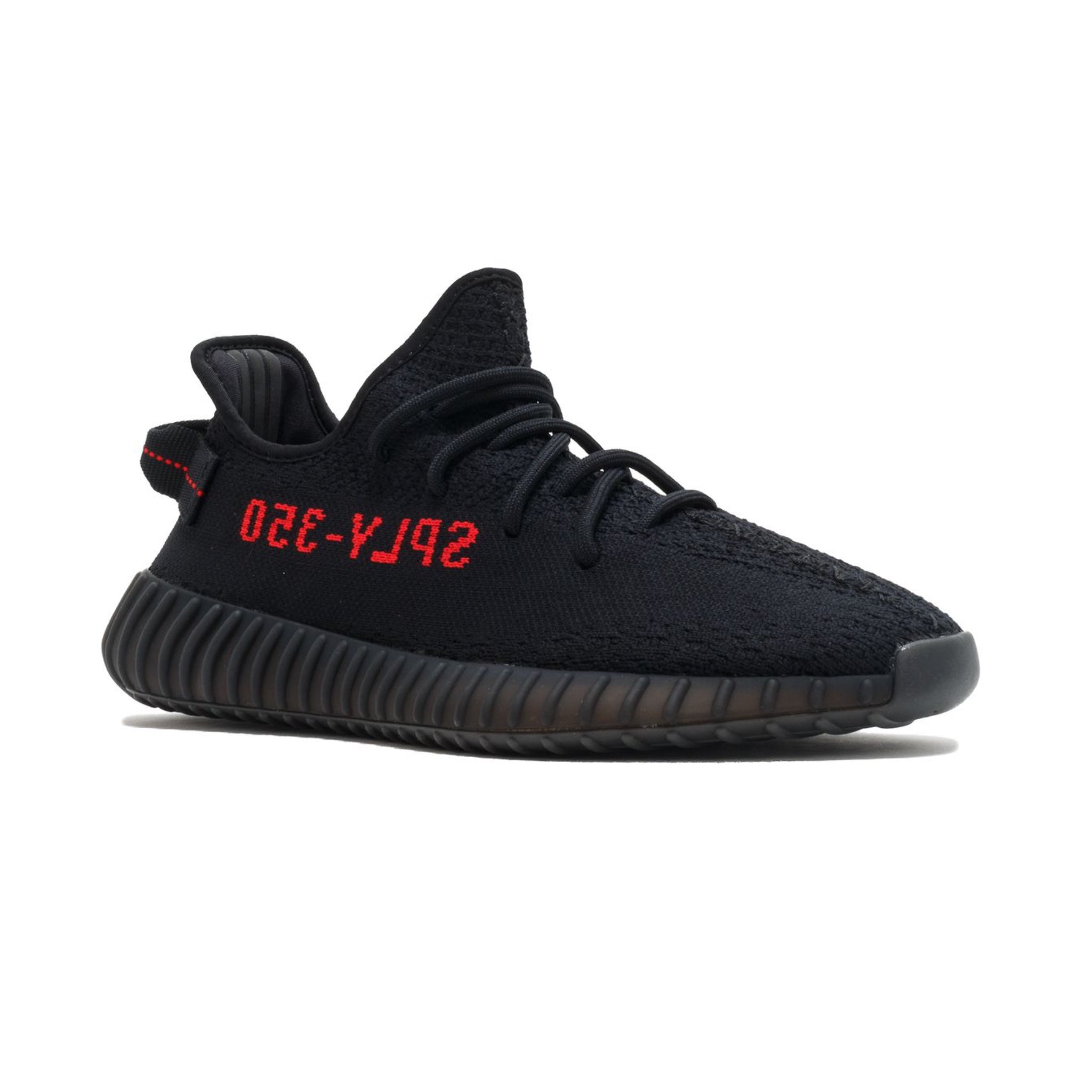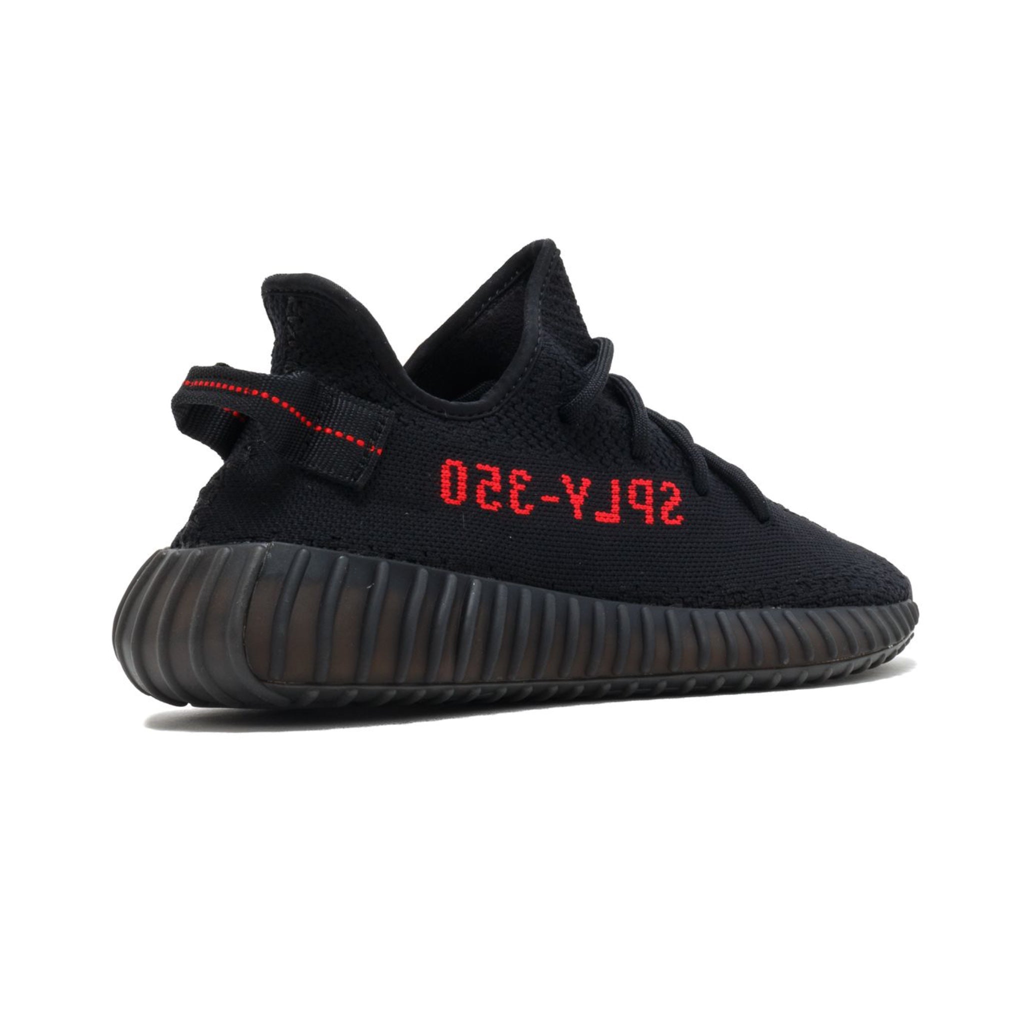 The Yeezy Boost 350 V2 'Bred' brings a classic colorway to its minimalist construction. The shoe's upper is built with Primeknit, finished in black and highlighted by the SPLY-350 branding on the side wall. More red marks the heel pull-loop, while rope laces secure the fit. Underfoot, a full-length Boost midsole wrapped in a black rubber cage provides cushioning. A rubber outsole with cutouts provides traction.