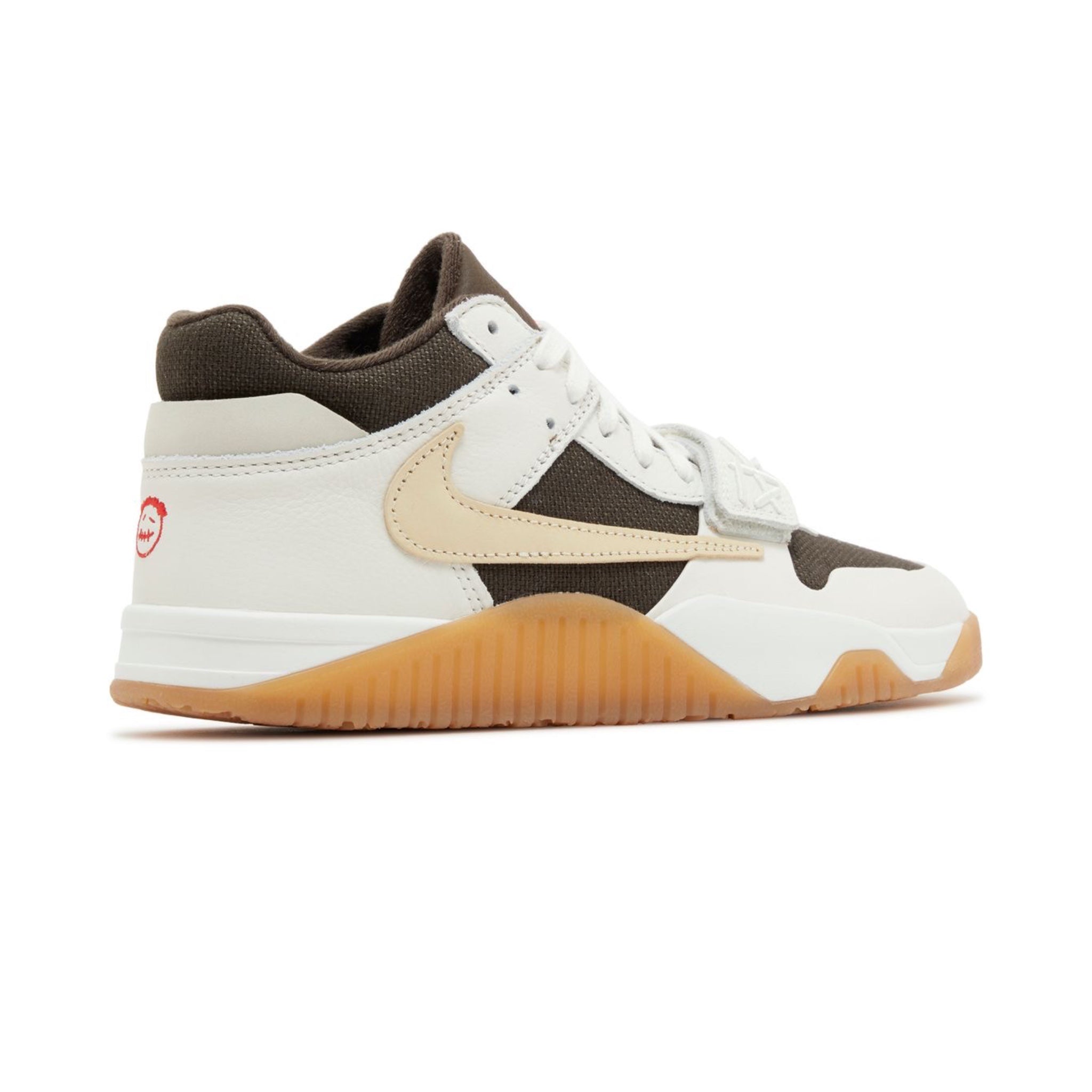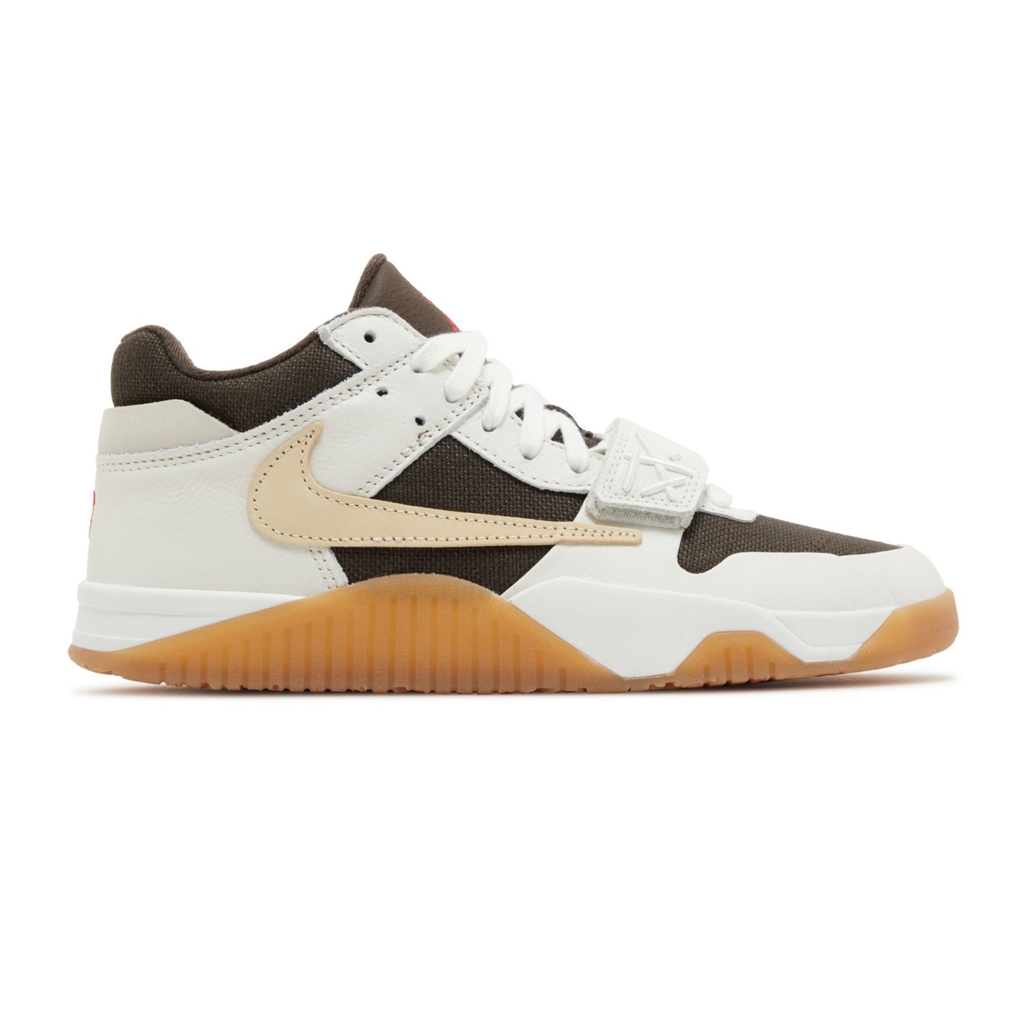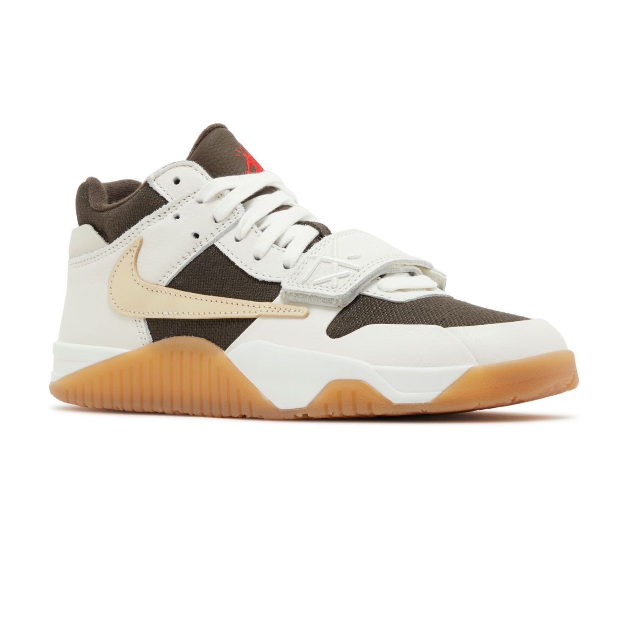 A neutral take on Travis Scott's debut signature shoes, the Travis Scott x Jordan Jumpman Jack TR 'Sail' have a dark brown canvas upper with off-white leather overlays and a beige backward Swoosh. These sneakers have an adjustable midfoot strap, paired with regular shoelaces and contrasting red accents on the Jumpman tongue logo. Scott's Cactus Jack face logo is embossed on the back heel, while a white foam midsole and a gum rubber outsole complete the look.