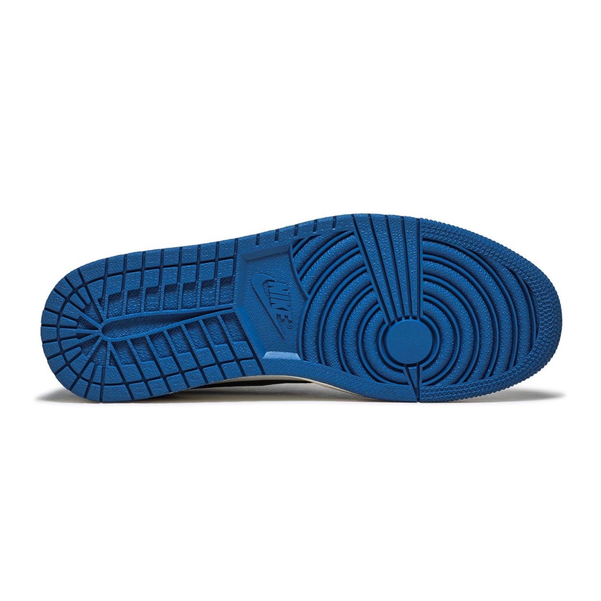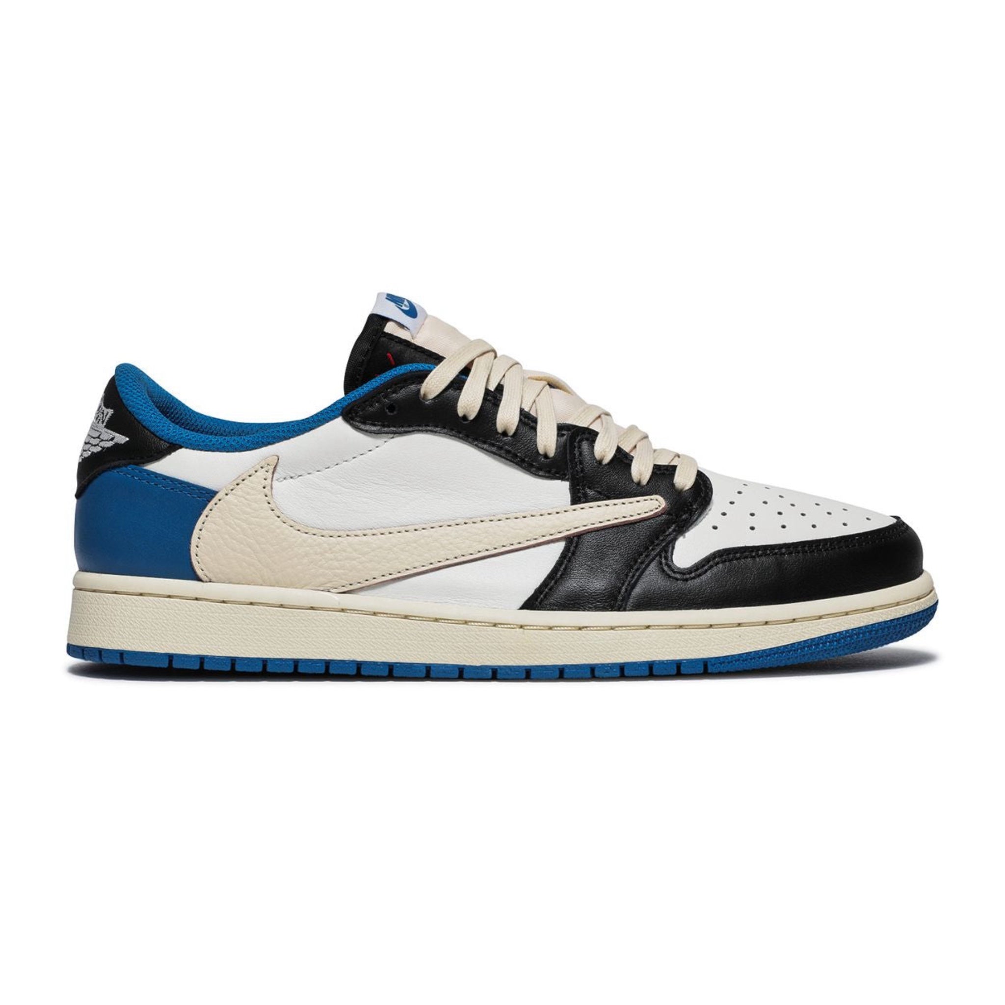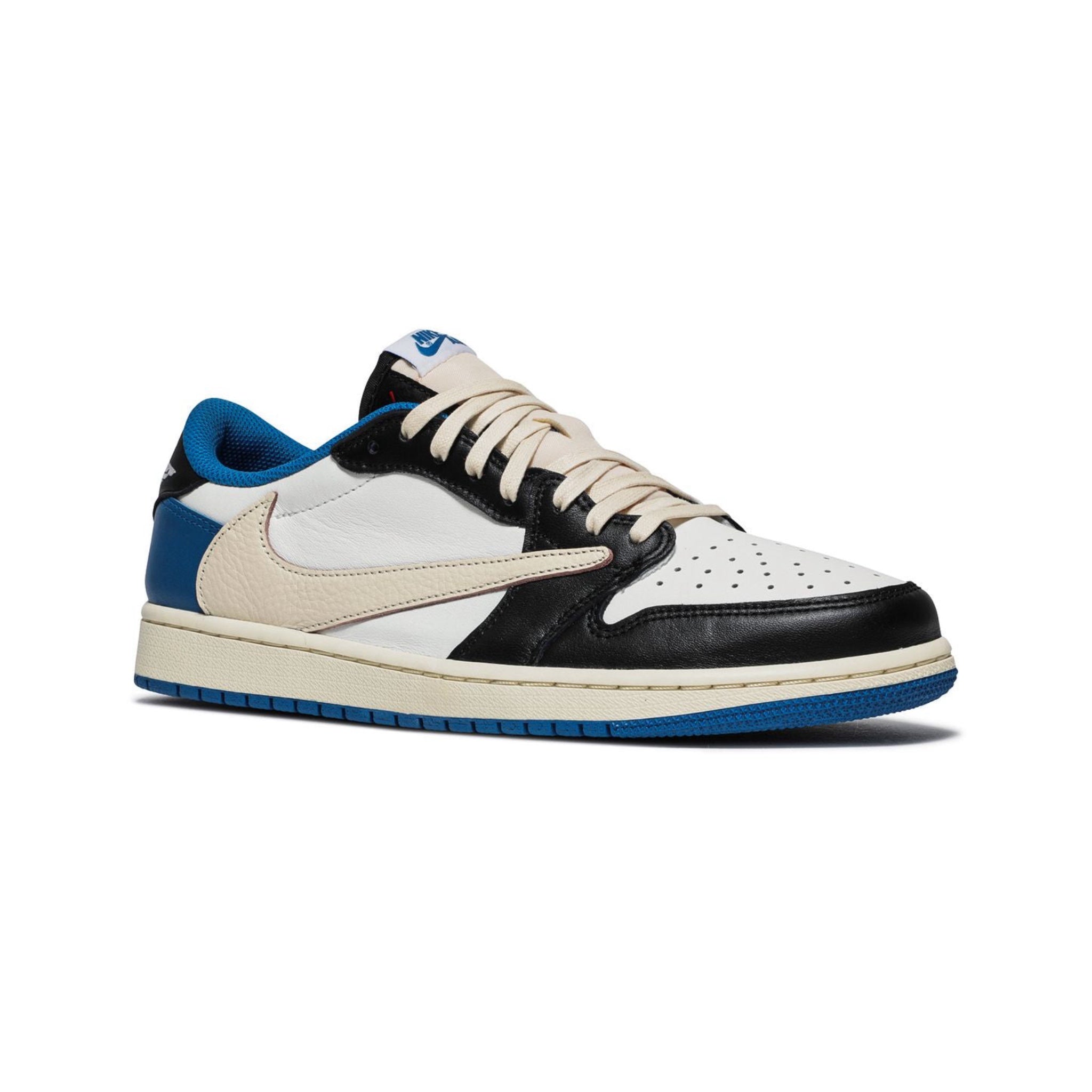 The Fragment Design x Travis Scott x Air Jordan 1 Retro Low released as part of a collaboration with the Houston rapper and Japanese imprint. Featuring a colorway that recalls previous fragment design collaborations, the shoe's upper is built with a white leather base, overlaid by black and royal blue and complemented by inverted Swoosh branding on the lateral side. The heel patch of the left shoe includes Cactus Jack branding and a smiley face logo, while fragment's lightning bolt marks the right shoe. Underfoot, a two-tone rubber cupsole anchors the design.