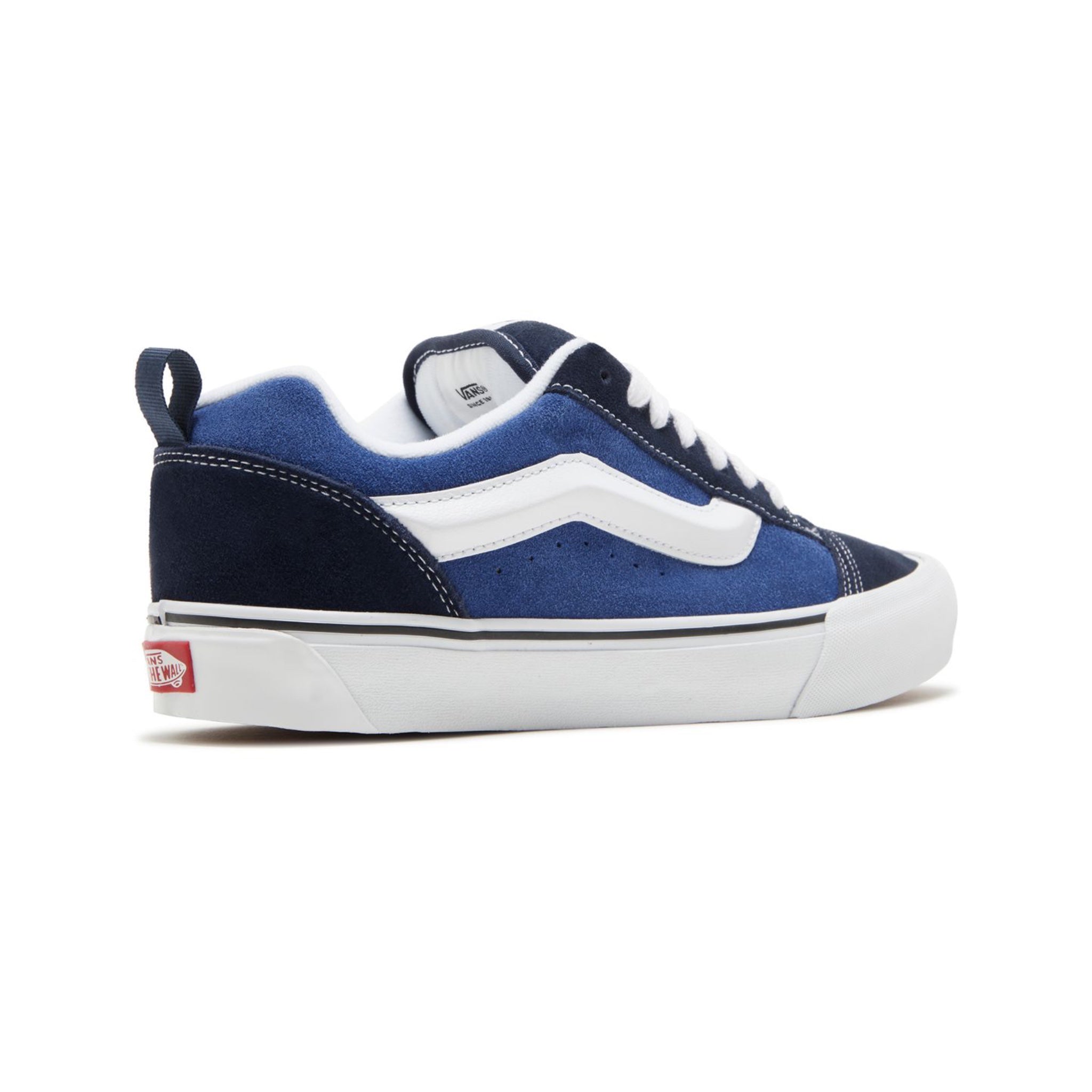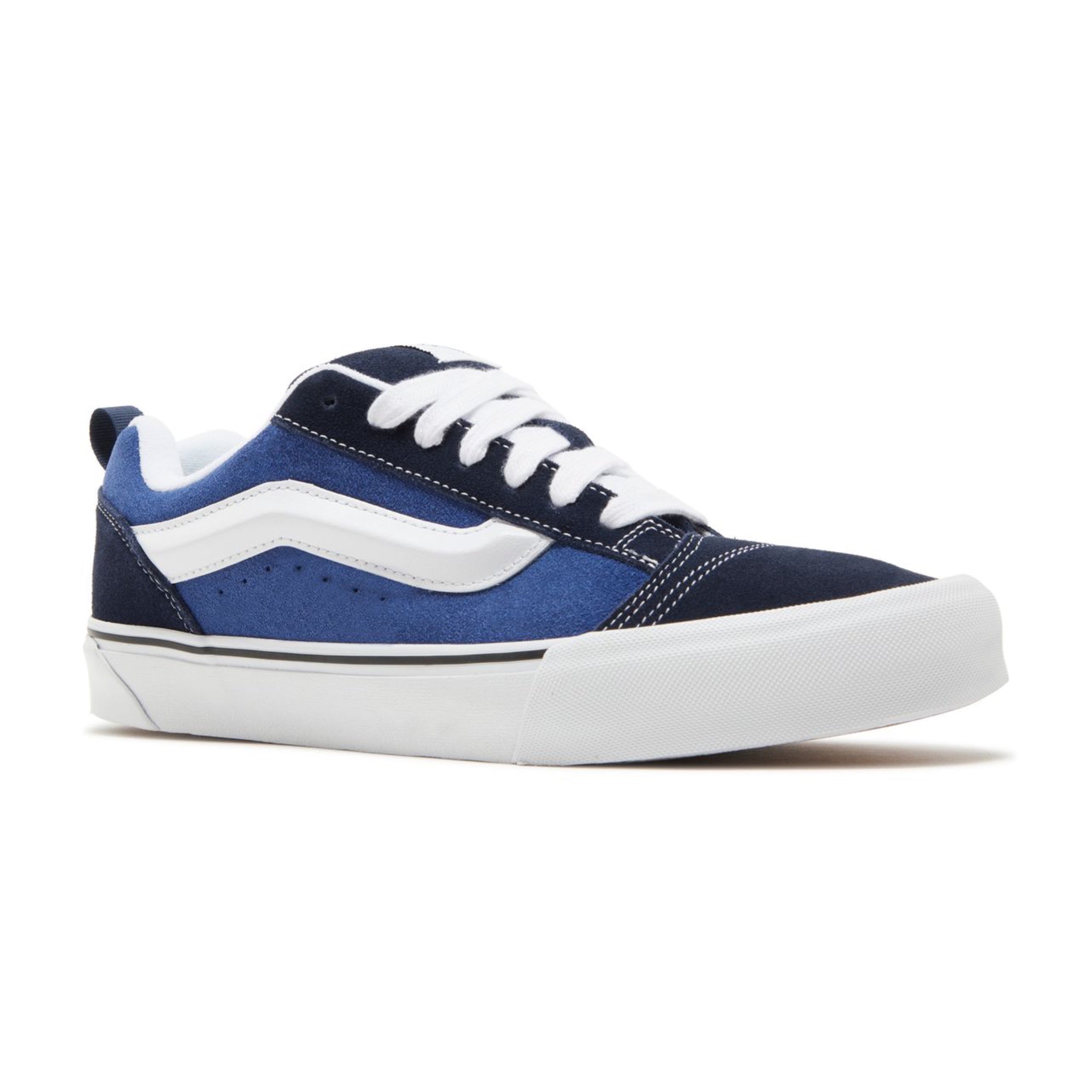 The Vans Knu-Skool 'Navy White' takes it back to a '90s silhouette that originates from the Old Skool. Wide laces secure the black suede upper, accented with contrast stitching and a 3D-molded Sidestripe. A stuffed tongue and a padded collar help keep you comfortable from the get-go, while a heel pull tab makes for easy on and off. A white vulcanized rubber midsole works with a gum rubber, waffle-patterned outsole.